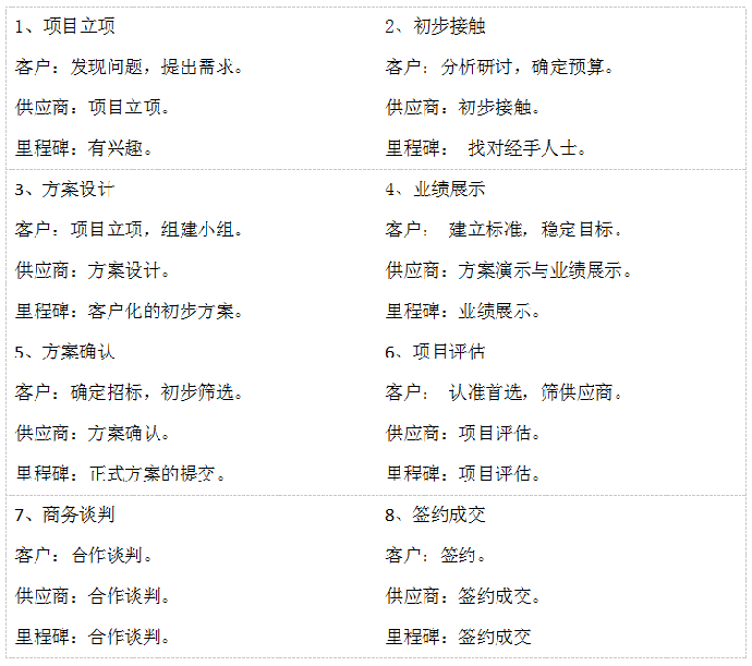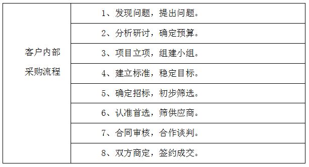 | 企業(yè)業(yè)務(wù)管控需要一套完善的管理系統(tǒng),我們這里特別設(shè)定企業(yè)業(yè)務(wù)管控系統(tǒng)。它不僅僅是一種管理理念,同時(shí)也是一個(gè)管理體系、一個(gè)操作性很強(qiáng)的管理系統(tǒng)。 業(yè)務(wù)管控系統(tǒng)非常提倡過程管理,而且控制過程比控制結(jié)果更重要。在銷售中,一個(gè)銷售項(xiàng)目受到太多來(lái)自內(nèi)部和外部因素的影響,其結(jié)果的成敗與否是難以預(yù)測(cè)和控制的。 一、業(yè)務(wù)管控系統(tǒng)的特點(diǎn) 主要是讓原來(lái)只掌握在銷售人員手中的有關(guān)銷售過程的信息向銷售團(tuán)隊(duì)、銷售經(jīng)理和企業(yè)公開,使得: l 銷售人員的信息更加公開化,便于掌控客戶的進(jìn)展; l 讓項(xiàng)目的銷售過程更加明確化,標(biāo)準(zhǔn)化,系統(tǒng)化; l 便于項(xiàng)目?jī)?nèi)部的角色分工,使團(tuán)隊(duì)合作進(jìn)一步加強(qiáng); l 更好地做好銷售管理與銷售預(yù)測(cè)的工作; l 企業(yè)積累應(yīng)有的銷售知識(shí)和客戶資源。 二、企業(yè)業(yè)務(wù)管控系統(tǒng)的模型圖 如圖6-1所示。 ![]() 圖6-1 企業(yè)業(yè)務(wù)管控系統(tǒng)的模型圖 基礎(chǔ)組成要素:了解客戶內(nèi)部采購(gòu)流程 客戶內(nèi)部采購(gòu)流程是從客戶的角度對(duì)整個(gè)采購(gòu)過程一般必須經(jīng)過的步驟進(jìn)行劃分和描述。它通過跟蹤和記錄客戶采購(gòu)目前的狀態(tài)以及客戶、競(jìng)爭(zhēng)對(duì)手的回應(yīng),依據(jù)對(duì)內(nèi)部采購(gòu)流程的劃分,分析并確定目前客戶采購(gòu)所處的階段。讓我們更清晰的去了解,如何去對(duì)這八大流程階段進(jìn)行分析,該從哪幾個(gè)方面進(jìn)行著手??蛻魞?nèi)部采購(gòu)流程包含八個(gè)階段如表6-1所示。 表6-1 八個(gè)階段表 ![]() 1、 發(fā)現(xiàn)問題,提出問題; 一般公司都是有現(xiàn)成的供應(yīng)商,我們的機(jī)會(huì)點(diǎn)就在尋找目前客戶與現(xiàn)有供應(yīng)商合作中的不滿意或者問題,往往問題越大,我們的機(jī)會(huì)點(diǎn)就比較有優(yōu)勢(shì)。所以,在采購(gòu)方的需求醞釀的階段,銷售方在這個(gè)階段介入明顯是最好的時(shí)機(jī),畢竟“先入為主”,銷售方可以在這個(gè)階段影響到采購(gòu)方的后來(lái)的“采購(gòu)標(biāo)準(zhǔn)”。 2、分析研討,確定預(yù)算; 了解目前項(xiàng)目的預(yù)算,確立項(xiàng)目立項(xiàng)的可能性,萬(wàn)一項(xiàng)目的預(yù)算少了,一般都要通過老板來(lái)進(jìn)一步申請(qǐng),這時(shí),往往與老板見面的可能性較大,有時(shí)項(xiàng)目的經(jīng)辦人無(wú)法說服他自己的老板,有可能請(qǐng)你協(xié)同說服。 3、項(xiàng)目立項(xiàng),建立小組; 緊接著,在客戶項(xiàng)目立項(xiàng)階段,銷售顧問應(yīng)當(dāng)提供準(zhǔn)確信息,培養(yǎng)內(nèi)部的spy立項(xiàng),準(zhǔn)備應(yīng)標(biāo)。因此需要對(duì)內(nèi)部采購(gòu)流程相當(dāng)了解,如此才能建立項(xiàng)目采購(gòu)的優(yōu)勢(shì)。 4、建立標(biāo)準(zhǔn),穩(wěn)定目標(biāo); 當(dāng)客戶的采購(gòu)部門開始收集信息和標(biāo)書時(shí),銷售顧問應(yīng)當(dāng)在內(nèi)部確認(rèn)招標(biāo)范圍,主動(dòng)了解技術(shù)表述的內(nèi)容,參與制定采購(gòu)標(biāo)準(zhǔn),目的是為了建立客戶關(guān)系,同時(shí)了解競(jìng)爭(zhēng)對(duì)手以及客戶內(nèi)部的關(guān)系。 5、確定招標(biāo),初步篩選; 經(jīng)辦人通常是客戶內(nèi)部的采購(gòu)經(jīng)理類的角色,他需要發(fā)布信息,收集信息,同時(shí),初步篩選合格的供應(yīng)商,一般是從十家供應(yīng)商剩下三家等,為確定首選供應(yīng)商做鋪墊。 6、認(rèn)準(zhǔn)首選,篩供應(yīng)商; 通過技術(shù)標(biāo)與商務(wù)標(biāo)的因素而確立篩選的標(biāo)準(zhǔn),例如:價(jià)格、質(zhì)量、品質(zhì)、品牌、行業(yè)標(biāo)準(zhǔn)、職業(yè)化、關(guān)系等因素來(lái)選擇首選的供應(yīng)商。 7、合同審核,合作談判; 最為采購(gòu)方來(lái)說,確定供應(yīng)商后,要在談判中盡量壓低成本,并為企業(yè)爭(zhēng)取有利的付款方式降低風(fēng)險(xiǎn)。該項(xiàng)目后續(xù)實(shí)施如何很大程度上取決于合同條款上的具體規(guī)定,所以該過程是非常關(guān)鍵的,客戶可能專門組織談判小組,與首選供應(yīng)商來(lái)談具體的條款。 8、雙方商定,簽約成交。 商務(wù)具體條款雙方商定后,雙方法人簽署合同。開始進(jìn)入具體的合作及售后服務(wù)階段,在該階段之前,可以說銷售方是很成功的,否則,對(duì)方也不會(huì)選擇和你合作。有人錯(cuò)認(rèn)為銷售活動(dòng)到此結(jié)束了,其實(shí)還沒有,這只是個(gè)開始,如何將該客戶綁定為企業(yè)的忠實(shí)客戶,這就需要銷售方在實(shí)施及售后客戶關(guān)系維系方面下工夫了。 該管控系統(tǒng)的起點(diǎn)是客戶內(nèi)部采購(gòu)流程。產(chǎn)品、服務(wù)的供應(yīng)方了解客戶內(nèi)部采購(gòu)流程的目的是為了提高銷售的成功率。每個(gè)客戶都有自己的一套內(nèi)部采購(gòu)流程。供應(yīng)方想要實(shí)現(xiàn)銷售,必須按照客戶的規(guī)則行事,根據(jù)客戶的內(nèi)部采購(gòu)流程來(lái)一步一步推進(jìn)銷售過程,