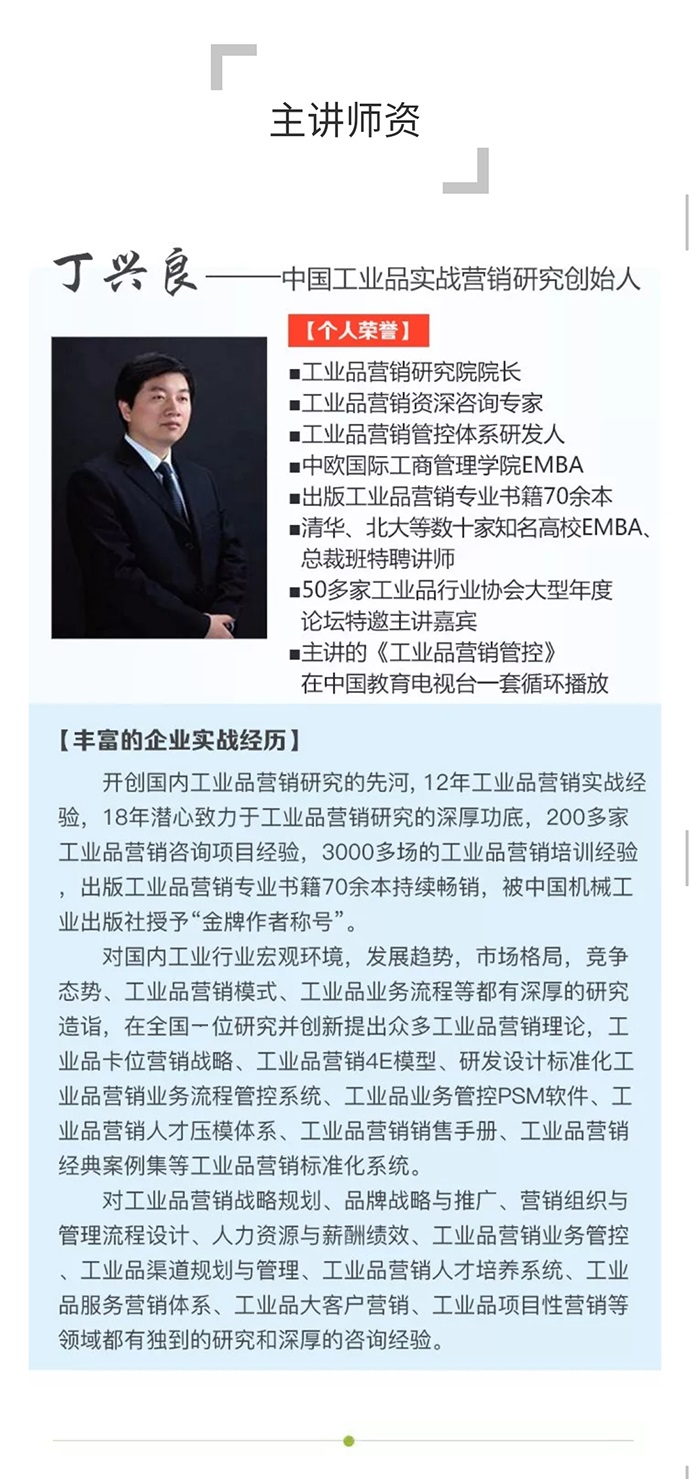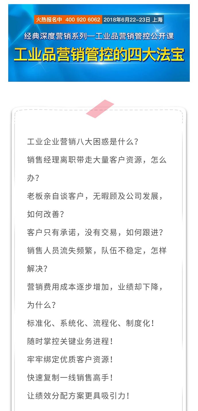 【營銷管控公開課預告】2018年6月22-23日 深度營銷管控系列“工業(yè)品營銷管控”公開課! 點擊次數(shù):5829發(fā)布時間:2018-6-1 17:06:54 上一條:【新產(chǎn)品品牌及推廣開課預告】 6月8-10日 工業(yè)新產(chǎn)品市場規(guī)劃與推廣傳播策略公開課下一條:【總裁班開課預告】8月24-26日 中國工業(yè)品營銷實戰(zhàn)咨詢式輔導總裁班!