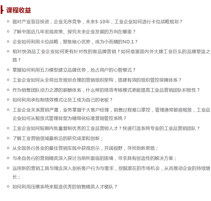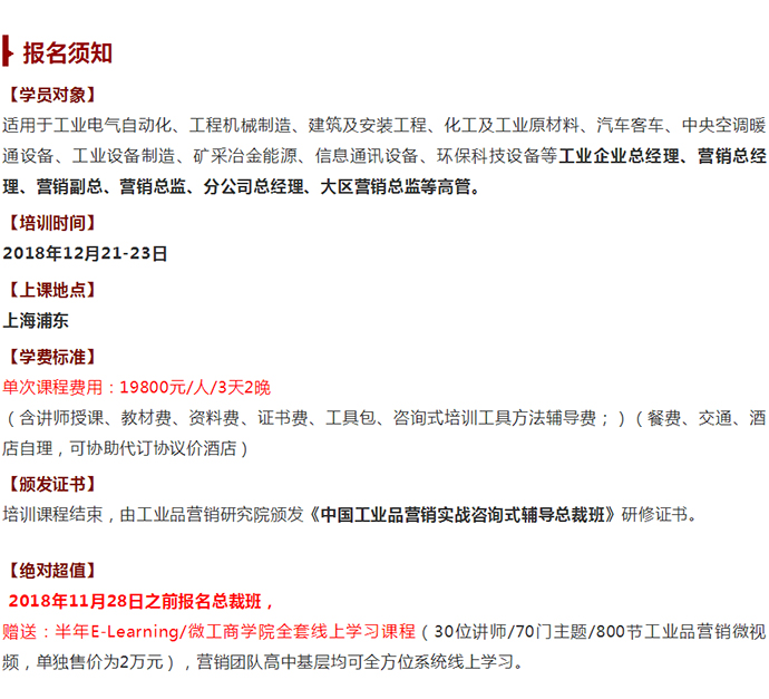 【總裁班開(kāi)課預(yù)告】12月21-23日 中國(guó)工業(yè)品營(yíng)銷實(shí)戰(zhàn)咨詢式輔導(dǎo)總裁班! 點(diǎn)擊次數(shù):6209發(fā)布時(shí)間:2018-6-28 11:15:45 上一條:【人才壓模開(kāi)課預(yù)告】7月26-29日 工業(yè)品營(yíng)銷精英人才壓模系統(tǒng)公開(kāi)課下一條:【人才壓模開(kāi)課預(yù)告】11月22-25日 工業(yè)品營(yíng)銷精英人才壓模系統(tǒng)公開(kāi)課