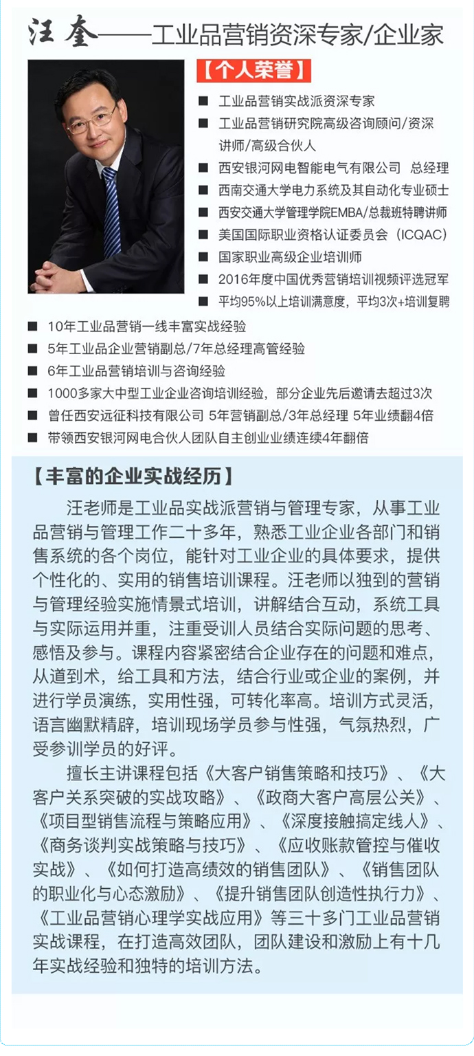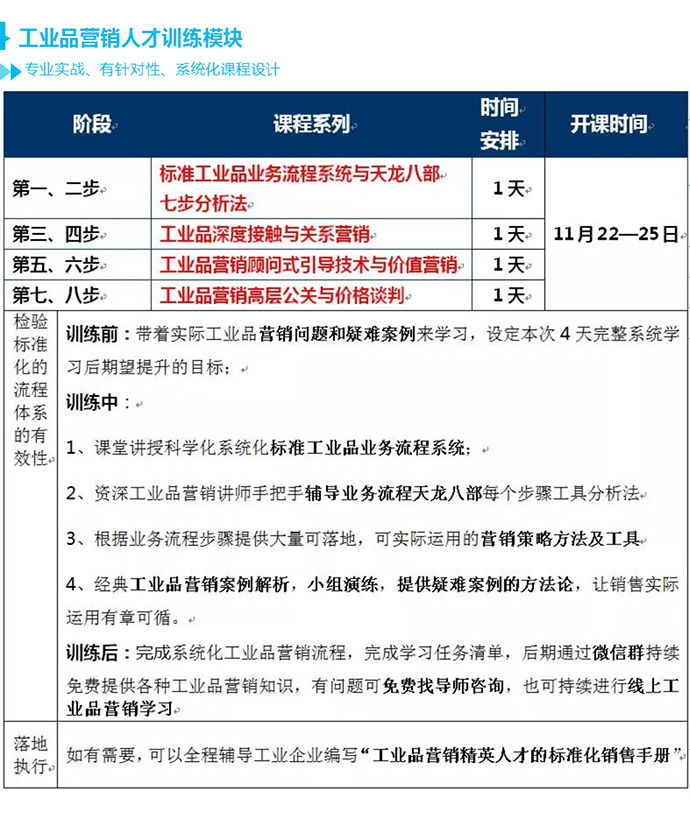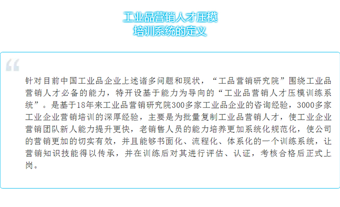 【人才壓模開課預(yù)告】11月22-25日 工業(yè)品營銷精英人才壓模系統(tǒng)公開課 點(diǎn)擊次數(shù):5959發(fā)布時(shí)間:2018-6-28 11:22:27 上一條:【總裁班開課預(yù)告】12月21-23日 中國工業(yè)品營銷實(shí)戰(zhàn)咨詢式輔導(dǎo)總裁班!下一條:【營銷管控公開課預(yù)告】10月26-27日 深度營銷管控系列“工業(yè)品營銷管控”公開課!