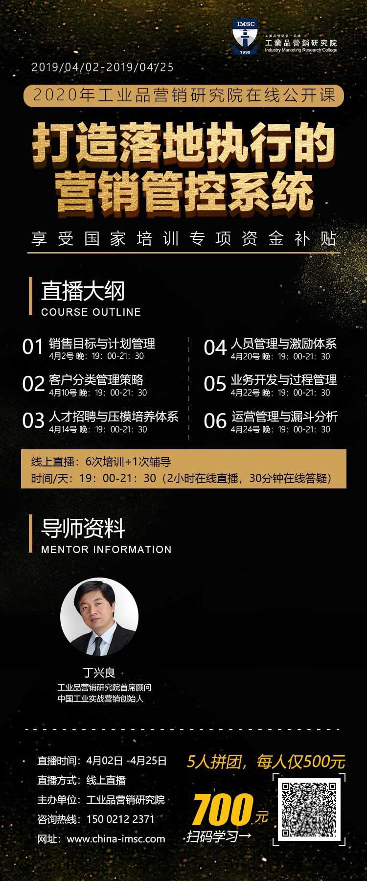 4月2日—4月25日,在線直播:打造落地執(zhí)行的工業(yè)品營銷管控系統(tǒng)公開課(17個(gè)小時(shí),適合中高層,線下公開課原價(jià)8000元/人),6次直播課程,2:30小時(shí)/次+1次2小時(shí)深度輔導(dǎo)!