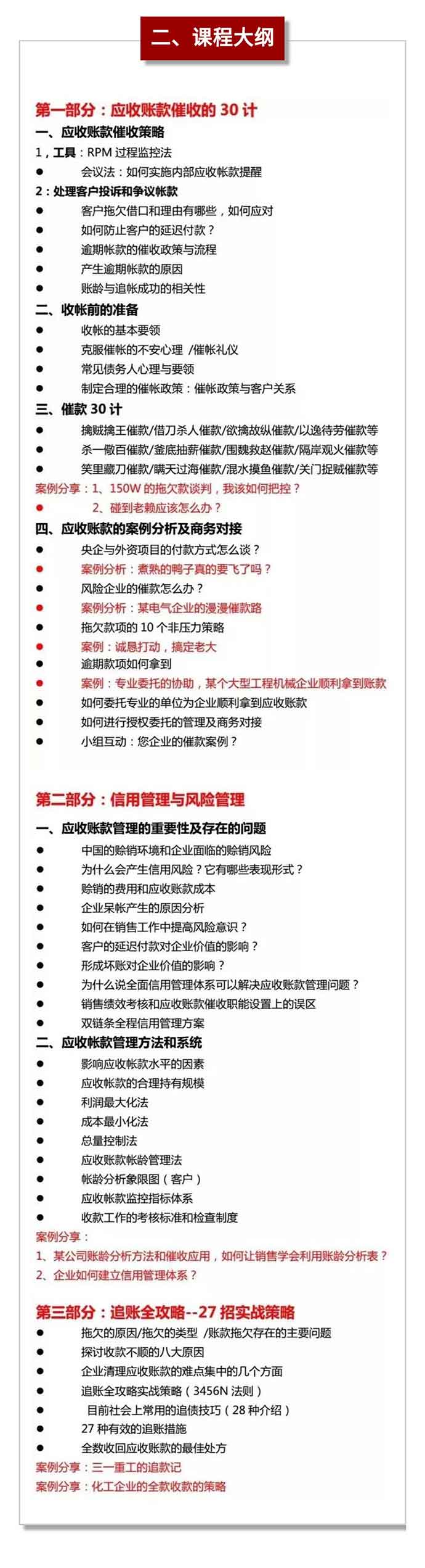 1-從銷售催收實(shí)戰(zhàn)技巧的角度來總結(jié)催款30計(jì)的策略;從企業(yè)信用管理與風(fēng)險(xiǎn)防范的角度來分析風(fēng)險(xiǎn)管控;催收專家從落地執(zhí)行的角度來分析如何才能確??铐?xiàng)有效回收,甚至可以把催收實(shí)戰(zhàn)的感悟與經(jīng)驗(yàn)進(jìn)行系統(tǒng)整合并和盤托出,2天時(shí)間學(xué)到催收高手10年的寶貴經(jīng)驗(yàn),形成催收、信用、追賬一站式落地執(zhí)行的方案。