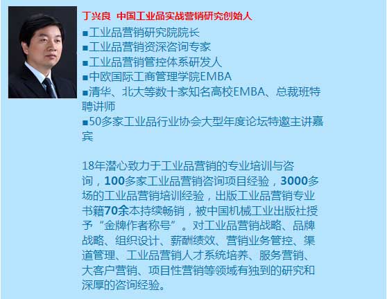 【授課講師】工業(yè)品營銷研究院院長 丁興良 領(lǐng)銜專家講師團 【溫馨提示】:可以報名單次公開課或者分層級系統(tǒng)管理,詳情請來電咨詢400-920-6062.