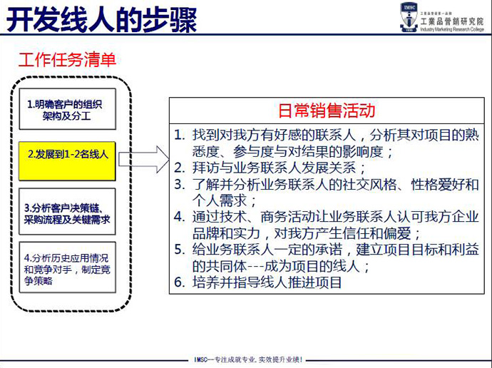 通常情況下,在整個(gè)工業(yè)品業(yè)務(wù)流程銷售過(guò)程中,有兩個(gè)關(guān)鍵階段對(duì)整個(gè)項(xiàng)目成敗尤為重要“ 深度接觸、高層公關(guān) ”,任何一個(gè)項(xiàng)目搞定這兩個(gè)階段意味著項(xiàng)目成功概率將大大提高。