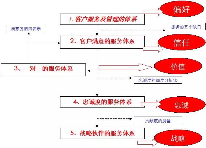 IMSC研究得出:服務大客戶一共有五個層次,需要來做提升,五個層次的提升能獲得相應的客戶利益