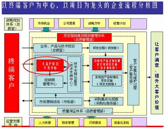 工業(yè)品行業(yè)項(xiàng)目決策始終貫徹一個(gè)中心——“以客戶為中心”。大客戶一般需要的不僅僅是提供現(xiàn)有產(chǎn)品,大多都是根據(jù)他們需求及潛在問題研發(fā)而來。因此,銷售涉及到的更多是屬于項(xiàng)目范疇。終端客戶的需求開發(fā),往往有項(xiàng)目開發(fā)中心引導(dǎo)需求,技術(shù)支持中心提供深入挖掘,研發(fā)中心提供技術(shù)實(shí)現(xiàn);項(xiàng)目簽單后,移交項(xiàng)目實(shí)施部門,客戶服務(wù)部門進(jìn)行后續(xù)維護(hù);因此,大客戶戰(zhàn)略營銷往往是以終端客戶為中心,以項(xiàng)目為龍頭來帶動(dòng)業(yè)務(wù)發(fā)展。