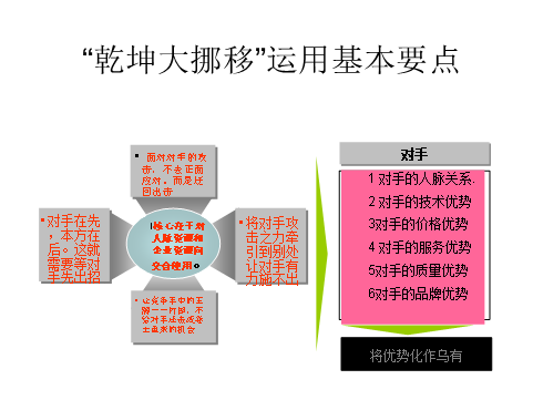 乾坤大挪移運(yùn)用到營銷工作中,其要旨在于:不去硬對硬去抗擊對手的攻擊,而是把對手的攻擊點(diǎn)轉(zhuǎn)移在其他地方,巧妙地化解對方的力量。在工業(yè)品的營銷中,對手的攻擊點(diǎn)無非是技術(shù),價(jià)格,服務(wù),質(zhì)量,品牌,客情等六個(gè)方面。尤其是客情關(guān)系的運(yùn)作,在對大客戶的爭奪上更為明顯。作為防守一方,如果正面相對有備而來的侵入者,難免會(huì)落下風(fēng)。如能見招拆招,分散對方的攻擊點(diǎn);往往能取得更佳的效果。
