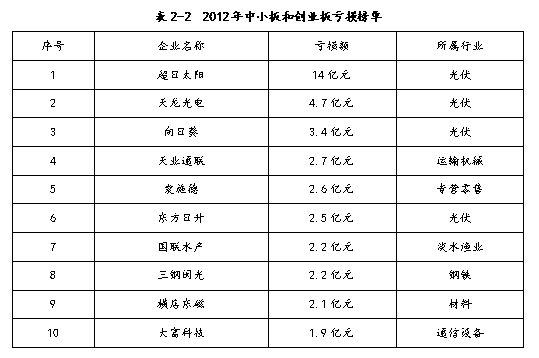 不少中小企業(yè)的老板反映2012年的經(jīng)濟(jì)形勢(shì)比08年金融危機(jī)時(shí)還慘,上市公司的年報(bào)顯然印證了這一點(diǎn)。尤其在2012年陷入行業(yè)“冰凍期”的中國(guó)光伏行業(yè),更是哀鴻遍野一片。虧損情況如表2-2所示。