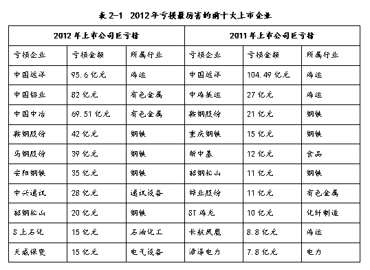 3月27日中國(guó)遠(yuǎn)洋披露2012年業(yè)績(jī)報(bào)告,95.6億元的巨額虧損使公司連續(xù)第二年成為“虧損王”,同日一起 披露年報(bào)的中國(guó)鋁業(yè)、鞍鋼股份、中興通訊和S上石化四家企業(yè)也因巨額虧損成功入選A股巨虧榜前十名。如表2-1所示。