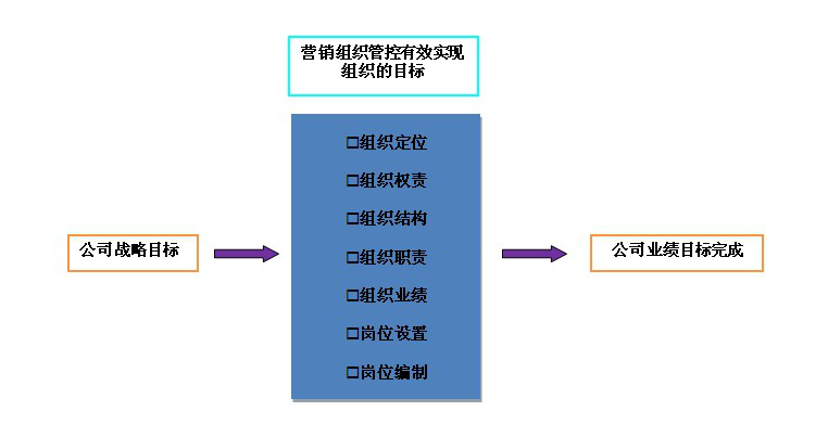 組織管控分為兩部分,一部分是集團(tuán)公司對(duì)于分公司的管控,另一部分是指公司整體對(duì)于各分職能部門(mén)的管控。而在這里,我們重點(diǎn)分析公司整體對(duì)于各分職能部門(mén)的管控。對(duì)于一個(gè)企業(yè)來(lái)說(shuō),最為重要的是營(yíng)銷(xiāo)組織,如何進(jìn)行營(yíng)銷(xiāo)組織的有效管控,是企業(yè)發(fā)展的關(guān)鍵一步。特別在一些大公司、大集團(tuán),以及大部分的工業(yè)品企業(yè),營(yíng)銷(xiāo)組織的管控更為重要。營(yíng)銷(xiāo)組織管控是指企業(yè)運(yùn)用組織設(shè)計(jì)來(lái)實(shí)現(xiàn)公司對(duì)營(yíng)銷(xiāo)組織的管理及控制。營(yíng)銷(xiāo)組織管控是有效實(shí)現(xiàn)組織目標(biāo)的管理手段,通過(guò)實(shí)施管控將組織目標(biāo)落實(shí)到每個(gè)崗位,每個(gè)員工,最終實(shí)現(xiàn)組織的業(yè)績(jī)目標(biāo).組織管控圖如圖2-1所示。