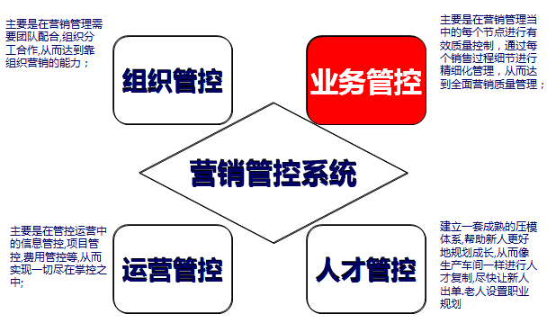 以上出現(xiàn)的問(wèn)題,很好地解釋了營(yíng)銷(xiāo)管控過(guò)程中重要的四個(gè)關(guān)鍵部分,分別是:組織管控、運(yùn)營(yíng)管控、人才管控、業(yè)務(wù)管控。
