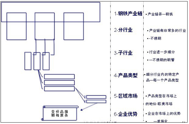 | 案例分享:思考上海騰達是如何進行市場戰(zhàn)略分析的? 上海騰達自控有限公司是一家專業(yè)從事自動化儀表制造、工程成套和經(jīng)營的中外合資企業(yè)。上海騰達自控有限公司采用工業(yè)超市的模式,進駐中國市場。不僅有自主研發(fā)的產(chǎn)品,而且還是美國、日本等國多家公司自控產(chǎn)品中國市場的主要代理商,有多年的推廣及應用國內(nèi)外公司自控產(chǎn)品的經(jīng)驗,上海騰達由于精準的市場分析和戰(zhàn)略定位,短短幾年中成為中國市場的最大銷售業(yè)績代理商。 在過去的幾年中,上海騰達的產(chǎn)品已被電力、石油、化肥、化工、輕工、玻璃、造紙、冶金、水廠、鍋爐等多個行業(yè)的用戶采用,業(yè)務遍及全中國。為做好用戶售前、售中及售后服務,上海騰達在全國各地設立有二十多個分公司和辦事處,在香港和深圳設有設計制造和培訓中心,可以為用戶提供系統(tǒng)設計、成套制作、產(chǎn)品銷售、現(xiàn)場投運、用戶培訓等服務。從ABB,松下,飛利浦,可口可樂,柯達這些著名跨國公司到寶鋼,華能電力,金陵石化,浦東機場,上海騰達的產(chǎn)品和服務已進入到中國的數(shù)千家企業(yè),獲得各界客戶的普遍認同和良好贊譽。 上海騰達以合作共贏作為企業(yè)的經(jīng)營方針,通過同國外公司的合作、合資、代理的方式,把國際上最新的技術和資本引進到中國,促進先進技術在中國的應用,并取得了驕人的業(yè)績。通過上海騰達的成功,我們一步一步揭開工業(yè)品市場戰(zhàn)略營銷的設計流程模式。 1、工業(yè)品市場戰(zhàn)略的六步流程分析 工業(yè)品營銷的成功必須建立在公司認識到營銷戰(zhàn)略的重要性。因為營銷戰(zhàn)略能夠使公司認識到各種各樣的市場變化和機會,并迅速地做出反應。 根據(jù)我們長期的工作經(jīng)驗積累,我們認為工業(yè)品市場戰(zhàn)略應該按照以下流程來設計: ![]() 1.1第一步:分析產(chǎn)業(yè)鏈 工業(yè)品隨著技術的發(fā)展,生產(chǎn)程度的提高,生產(chǎn)過程劃分為一系列有關聯(lián)的生產(chǎn)環(huán)節(jié)。分工與交易的復雜化對使得在經(jīng)濟中通過什么樣的形式聯(lián)結(jié)不同的分工與交易活動成為日益突出的問題。因此,搜尋一種企業(yè)組織結(jié)構以節(jié)省交易費用并進一步促進分工的潛力,相對于生產(chǎn)中的潛力會大大增加。企業(yè)難以應付越來越復雜的分工與交易活動,不得不依靠企業(yè)間的相互關聯(lián)。這種搜尋最佳企業(yè)組織結(jié)構的動力與實踐,成為產(chǎn)業(yè)鏈形成的條件。 產(chǎn)業(yè)鏈是一個概念,是各個產(chǎn)業(yè)部門之間基于一定的技術經(jīng)濟關聯(lián),并依據(jù)特定的邏輯關系和時空布局關系客觀形成的鏈條式關聯(lián)關系形態(tài)。產(chǎn)業(yè)鏈主要是基于各個地區(qū)客觀存在的區(qū)域差異,著眼發(fā)揮區(qū)域比較優(yōu)勢,借助區(qū)域市場協(xié)調(diào)地區(qū)間專業(yè)化分工和多維性需求的矛盾,以產(chǎn)業(yè)合作作為實現(xiàn)形式和內(nèi)容的區(qū)域合作載體。 產(chǎn)業(yè)鏈的本質(zhì)是用于描述一個具有某種內(nèi)在聯(lián)系的企業(yè)群結(jié)構,它是一個相對宏觀的概念,存在兩維屬性:結(jié)構屬性和價值屬性。產(chǎn)業(yè)鏈中大量存在著上下游關系和相互價值的交換,上游環(huán)節(jié)向下游環(huán)節(jié)輸送產(chǎn)品或服務,下游環(huán)節(jié)向上游環(huán)節(jié)反饋信息。 產(chǎn)業(yè)鏈分析主要是用于分析產(chǎn)業(yè)間差異(不同業(yè)務的價值差異),幫助企業(yè)找到富有價值與發(fā)展前景的具體業(yè)務?;旧?,產(chǎn)業(yè)鏈的分析方法是: ●定性分析方法:邁克爾·波特的五種力量競爭模型。 ●定量分析方法:產(chǎn)業(yè)鏈利潤 >利潤結(jié)構分析。 案例分享:上海騰達是如何分析電力系統(tǒng)產(chǎn)業(yè)鏈的前景? 上海騰達從國外引入新產(chǎn)品技術進來中國市場時,總會先分析該產(chǎn)品在產(chǎn)業(yè)鏈上的前景。以下是上海騰達引入電力系統(tǒng)產(chǎn)品時的分析思路。 電力系統(tǒng)的產(chǎn)品是一個較為特殊的產(chǎn)品,從供應鏈的角度上來講,這一產(chǎn)業(yè)的主要產(chǎn)品是能源產(chǎn)品,也就是電能,是全社會的吃穿住行和人們生活需要的公用產(chǎn)品。按照產(chǎn)品生產(chǎn)銷售供應鏈的這一條主線,電力行業(yè)供應鏈大致可以分為發(fā)電、輸電、配電和電能銷售等幾個環(huán)節(jié)。其中發(fā)電主要任務進行電能產(chǎn)品的生產(chǎn),這一環(huán)節(jié)的主要企業(yè)就是發(fā)電廠;輸電可以理解為與普通行業(yè)中的產(chǎn)品運輸相對應,輸電網(wǎng)也就是運輸電能產(chǎn)品的 “ 高速公路 ” ,與這一環(huán)節(jié)打交道部門和企業(yè)有調(diào)度中心 ( 主要負責輸電網(wǎng)絡運行安全 ) ,電力公司的網(wǎng)絡設施維護部門 ( 有點類似 “ 公路維護 ”) ;配電是電能產(chǎn)品的配送,相關部門主要是供電局 ( 公司 ) 負責配電網(wǎng)絡的運行與安全的部門等;電能銷售則包括電能的批發(fā) ( 躉售 ) 和零售,相關部門是電力公司的營銷部 ( 或者用電部 ) 等。 由于電能已經(jīng)成為人們?nèi)粘Ia(chǎn)和生活中消耗的主要能源,不論城市或農(nóng)村,不論生產(chǎn)或生