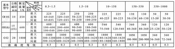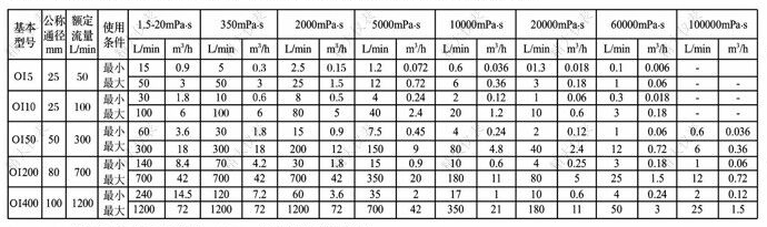 | 基本型號 | 公稱通徑(mm) | 額定流量(L/h) | 使用條件 | 粘度(mPa.s) | |||||||