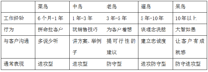 | 一、企業(yè)人才發(fā)展的四大困惑 第一大困惑: 你擁有屬于你的張良、韓信、蕭何嗎?留駐核心員工靠金錢,還是靠事業(yè),還是靠使命,我們拿什么留駐他們?如果不滿意,銷售精英就會離職,并且?guī)ё叽罅康目蛻糍Y源,特別是大客戶,導(dǎo)致公司業(yè)務(wù)出現(xiàn)短暫的休克,市場出現(xiàn)空白地區(qū),怎辦? 第二大困惑: 小企業(yè)靠“英雄”,但是英雄維護(hù)的成本太高,喜歡與公司叫板,挾太子以領(lǐng)諸侯,風(fēng)險太高;或者老板自己掌握公司重要客戶資源,但是加班加點,累得像個鬼一樣的,我該如何壯大呢? 第三大困惑: 有時銷售周期長,新銷售員一旦短時間內(nèi)無法達(dá)成銷售業(yè)績,心態(tài)扭曲,信心不足,成長困難,流失率驚人,我們該如何進(jìn)行銷售隊伍管理? 第四大困惑: 老鳥的積極性不高,往往小富即安,或者不想追求更好的銷售目標(biāo),新人的成長又太慢,或者因經(jīng)驗不足,導(dǎo)致得罪客戶,反而,恰得其反,因此.如何調(diào)動老鳥的激情與動力,如何快速與復(fù)制培養(yǎng)新人? 二、64%的人才黑洞效應(yīng) 我們假設(shè),一家企業(yè)里80%的員工是普通業(yè)務(wù)員, 20%的員工是超級業(yè)務(wù)員(簡稱銷售精英,老鳥)。一家企業(yè)里不可能每個業(yè)務(wù)員每次都能創(chuàng)造高效益,根據(jù)我們研究調(diào)查,通常一家企業(yè),只有36%的員工創(chuàng)造了利潤。那么我們會發(fā)現(xiàn),在這家企業(yè)里最終給企業(yè)創(chuàng)造利潤的只有36%,而64%的業(yè)務(wù)人員是無法創(chuàng)造效應(yīng)的,可以說是巨大的成本,這就是我們所說的人才黑洞效應(yīng)。甚至有時候還不止64%的成本黑洞,員工的基本工資、保險福利、管理成本、機會成本、灰色成本等等,算下來企業(yè)的人才成本是巨大的。人才黑洞效應(yīng)圖如圖5-1所示。 ![]() 圖5-1 人才黑洞效應(yīng)圖 那么,我們該如何消除這64%的人才成本黑洞效應(yīng)呢?經(jīng)過我們研究發(fā)現(xiàn),通過經(jīng)驗復(fù)制,把菜鳥培養(yǎng)成老鳥,可以得到很好的效果。如何進(jìn)行經(jīng)驗復(fù)制?這就需要一個完善的人才復(fù)制系統(tǒng),一個營銷保障體系。例如我們馬上在下節(jié)介紹的銷售手冊、案例庫、策劃集、軟件系統(tǒng)等等。只要我們能夠成功的將人才體系打造成功,我們的黑洞又可能降到30%,甚至更少。 三、銷售人才的各個階級; 1、 銷售境界上,五種鳥的對比; 銷售人才的各個階級表如表5-1所示。 表5-1 銷售人才的各個階級表 ![]() 根據(jù)上面的圖表,我們可以看出一個銷售人員成長會有五種境界,同時這五個境界是不可以跳的,只有縮短時間,成長更快同時,制造業(yè)行業(yè)競爭越來越激烈,價格戰(zhàn)打得越來越厲害,所以,銷售人員從價格提升到價值是非常有必要的。 從以上的圖表中,我們發(fā)現(xiàn)了一個問題:雖然呆鳥的境界很好,但是一般公司里真的有那么多呆鳥嗎?答案是否定的。 經(jīng)過我們調(diào)查: 優(yōu)秀的企業(yè)中銷售人員按照比例分為:菜鳥占30%、中鳥占20%,老鳥占40%,遛鳥占5%,呆鳥5%; 中等的企業(yè)中銷售人員按照比例分為:菜鳥占50%、中鳥占30%,老鳥占15%,遛鳥占3%,呆鳥2%; 較差的企業(yè)中銷售人員按照比例分為:菜鳥占60%、中鳥占30%,老鳥占5%,遛鳥占4%,呆鳥1%; 【案例】為什么A公司比B公司的銷售業(yè)績好? A公司中銷售人員按照比例分為:菜鳥占30%、中鳥占20%,老鳥占40%,遛鳥占3%,呆鳥2%; B公司中銷售人員按照比例分為:菜鳥占15%、中鳥占20%,老鳥占30%,遛鳥占20%,呆鳥15%; 但是,結(jié)果卻是A公司的銷售業(yè)績好,原因是什么? 根據(jù)我們研究院的調(diào)研,老鳥人數(shù)占得比例比較多的企業(yè),銷售額一般會很高。因為從企業(yè)人力結(jié)構(gòu)上分析,成功銷售的通常是老鳥級別的人比較多,剛來的菜鳥剛剛起步,能夠拿單的并不多;而且老鳥級別的,往往可以拿大單,而中鳥級別的雖然可以做得下單,但是并不是大單。因此A公司的銷售業(yè)績在B公司之上。當(dāng)然,這只是片面的說法,我們是站在普遍的情況下來概述的。 從以上幾個方面也可以看得出來,老鳥是我們要培養(yǎng)菜鳥的方向;其實一個企業(yè)老鳥多了,遛鳥和呆鳥少些,業(yè)績還是會穩(wěn)定上升,相反遛鳥和呆鳥多不是什么好事,他們都成人精了,企業(yè)很難管理。 2、老鳥的職業(yè)標(biāo)準(zhǔn) 首先是業(yè)務(wù)上的專業(yè)知識和形象:包括一般的商業(yè)趨勢和經(jīng)濟動向的了解程度,客戶機構(gòu)的決策程序的熟悉度,以及對競爭對手的情況的及時把握。 其次是對客戶全心的服務(wù)態(tài)度:首先是誠實的態(tài)度,真心誠意幫助客戶解決問題。其次要認(rèn)識自己的產(chǎn)品,從長遠(yuǎn)的角度和客戶做生意,用客戶所能明白的方式去介紹產(chǎn)品,幫助客戶機構(gòu)為他們的客戶提供更佳的產(chǎn)品。 第三懂得望、聞、問、切的技巧:銷售過程中,學(xué)會問,懂得聽,說對話是非常重要的,透過提問來發(fā)現(xiàn)客戶的需求,用心傾聽來分析客戶沒有表達(dá)完整,需要我們來意會的內(nèi)容,根據(jù)不同客戶的需求是講適合的話題來非常重要的。 |