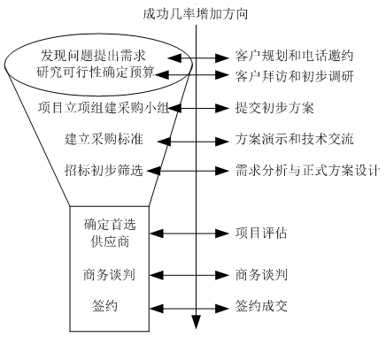 | 企業(yè)業(yè)務(wù)管控需要一套完善的管理系統(tǒng),我們這里特別設(shè)定企業(yè)業(yè)務(wù)管控系統(tǒng)。它不僅僅是一種管理理念,同時(shí)也是一個(gè)管理體系、一個(gè)操作性很強(qiáng)的管理系統(tǒng)。 業(yè)務(wù)管控系統(tǒng)非常提倡過(guò)程管理,而且控制過(guò)程比控制結(jié)果更重要。在銷(xiāo)售中,一個(gè)銷(xiāo)售項(xiàng)目受到太多來(lái)自內(nèi)部和外部因素的影響,其結(jié)果的成敗與否是難以預(yù)測(cè)和控制的。 一、業(yè)務(wù)管控系統(tǒng)的特點(diǎn) 主要是讓原來(lái)只掌握在銷(xiāo)售人員手中的有關(guān)銷(xiāo)售過(guò)程的信息向銷(xiāo)售團(tuán)隊(duì)、銷(xiāo)售經(jīng)理和企業(yè)公開(kāi),使得: l 銷(xiāo)售人員的信息更加公開(kāi)化,便于掌控客戶的進(jìn)展; l 讓項(xiàng)目的銷(xiāo)售過(guò)程更加明確化,標(biāo)準(zhǔn)化,系統(tǒng)化; l 便于項(xiàng)目?jī)?nèi)部的角色分工,使團(tuán)隊(duì)合作進(jìn)一步加強(qiáng); l 更好地做好銷(xiāo)售管理與銷(xiāo)售預(yù)測(cè)的工作; l 企業(yè)積累應(yīng)有的銷(xiāo)售知識(shí)和客戶資源。 二、企業(yè)業(yè)務(wù)管控系統(tǒng)的模型圖 如圖6-1所示。 ![]() 圖6-1 企業(yè)業(yè)務(wù)管控系統(tǒng)的模型圖 基礎(chǔ)組成要素:了解客戶內(nèi)部采購(gòu)流程 客戶內(nèi)部采購(gòu)流程是從客戶的角度對(duì)整個(gè)采購(gòu)過(guò)程一般必須經(jīng)過(guò)的步驟進(jìn)行劃分和描述。它通過(guò)跟蹤和記錄客戶采購(gòu)目前的狀態(tài)以及客戶、競(jìng)爭(zhēng)對(duì)手的回應(yīng),依據(jù)對(duì)內(nèi)部采購(gòu)流程的劃分,分析并確定目前客戶采購(gòu)所處的階段。讓我們更清晰的去了解,如何去對(duì)這八大流程階段進(jìn)行分析,該從哪幾個(gè)方面進(jìn)行著手??蛻魞?nèi)部采購(gòu)流程包含八個(gè)階段如表6-1所示。 表6-1 八個(gè)階段表 ![]() 1、 發(fā)現(xiàn)問(wèn)題,提出問(wèn)題; 一般公司都是有現(xiàn)成的供應(yīng)商,我們的機(jī)會(huì)點(diǎn)就在尋找目前客戶與現(xiàn)有供應(yīng)商合作中的不滿意或者問(wèn)題,往往問(wèn)題越大,我們的機(jī)會(huì)點(diǎn)就比較有優(yōu)勢(shì)。所以,在采購(gòu)方的需求醞釀的階段,銷(xiāo)售方在這個(gè)階段介入明顯是最好的時(shí)機(jī),畢竟“先入為主”,銷(xiāo)售方可以在這個(gè)階段影響到采購(gòu)方的后來(lái)的“采購(gòu)標(biāo)準(zhǔn)”。 2、分析研討,確定預(yù)算; 了解目前項(xiàng)目的預(yù)算,確立項(xiàng)目立項(xiàng)的可能性,萬(wàn)一項(xiàng)目的預(yù)算少了,一般都要通過(guò)老板來(lái)進(jìn)一步申請(qǐng),這時(shí),往往與老板見(jiàn)面的可能性較大,有時(shí)項(xiàng)目的經(jīng)辦人無(wú)法說(shuō)服他自己的老板,有可能請(qǐng)你協(xié)同說(shuō)服。 3、項(xiàng)目立項(xiàng),建立小組; 緊接著,在客戶項(xiàng)目立項(xiàng)階段,銷(xiāo)售顧問(wèn)應(yīng)當(dāng)提供準(zhǔn)確信息,培養(yǎng)內(nèi)部的spy立項(xiàng),準(zhǔn)備應(yīng)標(biāo)。因此需要對(duì)內(nèi)部采購(gòu)流程相當(dāng)了解,如此才能建立項(xiàng)目采購(gòu)的優(yōu)勢(shì)。 4、建立標(biāo)準(zhǔn),穩(wěn)定目標(biāo); 當(dāng)客戶的采購(gòu)部門(mén)開(kāi)始收集信息和標(biāo)書(shū)時(shí),銷(xiāo)售顧問(wèn)應(yīng)當(dāng)在內(nèi)部確認(rèn)招標(biāo)范圍,主動(dòng)了解技術(shù)表述的內(nèi)容,參與制定采購(gòu)標(biāo)準(zhǔn),目的是為了建立客戶關(guān)系,同時(shí)了解競(jìng)爭(zhēng)對(duì)手以及客戶內(nèi)部的關(guān)系。 5、確定招標(biāo),初步篩選; 經(jīng)辦人通常是客戶內(nèi)部的采購(gòu)經(jīng)理類(lèi)的角色,他需要發(fā)布信息,收集信息,同時(shí),初步篩選合格的供應(yīng)商,一般是從十家供應(yīng)商剩下三家等,為確定首選供應(yīng)商做鋪墊。 6、認(rèn)準(zhǔn)首選,篩供應(yīng)商; 通過(guò)技術(shù)標(biāo)與商務(wù)標(biāo)的因素而確立篩選的標(biāo)準(zhǔn),例如:價(jià)格、質(zhì)量、品質(zhì)、品牌、行業(yè)標(biāo)準(zhǔn)、職業(yè)化、關(guān)系等因素來(lái)選擇首選的供應(yīng)商。 7、合同審核,合作談判; 最為采購(gòu)方來(lái)說(shuō),確定供應(yīng)商后,要在談判中盡量壓低成本,并為企業(yè)爭(zhēng)取有利的付款方式降低風(fēng)險(xiǎn)。該項(xiàng)目后續(xù)實(shí)施如何很大程度上取決于合同條款上的具體規(guī)定,所以該過(guò)程是非常關(guān)鍵的,客戶可能專門(mén)組織談判小組,與首選供應(yīng)商來(lái)談具體的條款。 8、雙方商定,簽約成交。 商務(wù)具體條款雙方商定后,雙方法人簽署合同。開(kāi)始進(jìn)入具體的合作及售后服務(wù)階段,在該階段之前,可以說(shuō)銷(xiāo)售方是很成功的,否則,對(duì)方也不會(huì)選擇和你合作。有人錯(cuò)認(rèn)為銷(xiāo)售活動(dòng)到此結(jié)束了,其實(shí)還沒(méi)有,這只是個(gè)開(kāi)始,如何將該客戶綁定為企業(yè)的忠實(shí)客戶,這就需要銷(xiāo)售方在實(shí)施及售后客戶關(guān)系維系方面下工夫了。 該管控系統(tǒng)的起點(diǎn)是客戶內(nèi)部采購(gòu)流程。產(chǎn)品、服務(wù)的供應(yīng)方了解客戶內(nèi)部