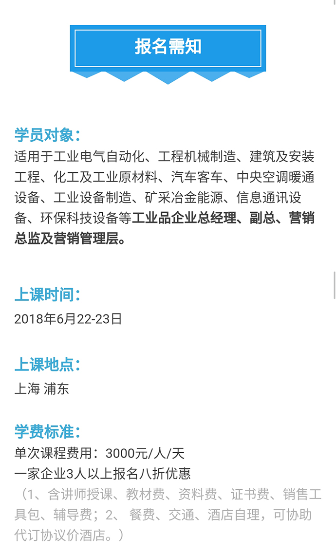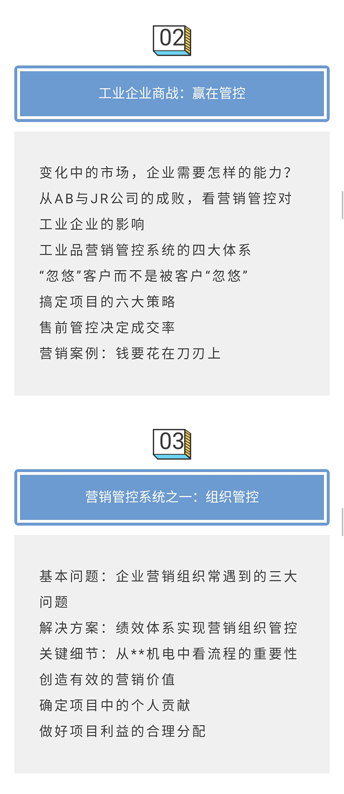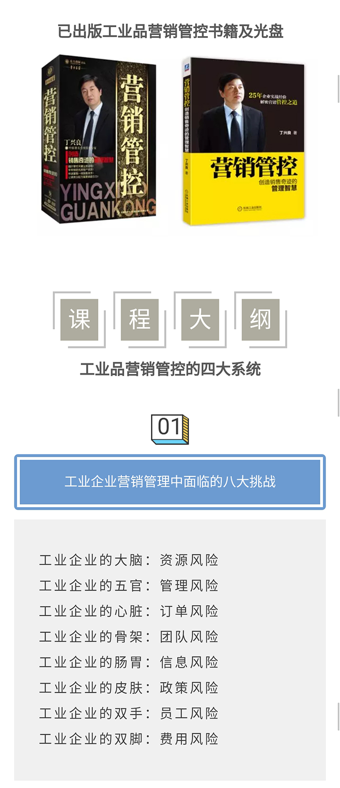 【營銷管控公開課預(yù)告】2018年6月22-23日 深度營銷管控系列“工業(yè)品營銷管控”公開課! 點(diǎn)擊次數(shù):5837發(fā)布時(shí)間:2018-6-1 17:06:54 上一條:【新產(chǎn)品品牌及推廣開課預(yù)告】 6月8-10日 工業(yè)新產(chǎn)品市場規(guī)劃與推廣傳播策略公開課下一條:【總裁班開課預(yù)告】8月24-26日 中國工業(yè)品營銷實(shí)戰(zhàn)咨詢式輔導(dǎo)總裁班!