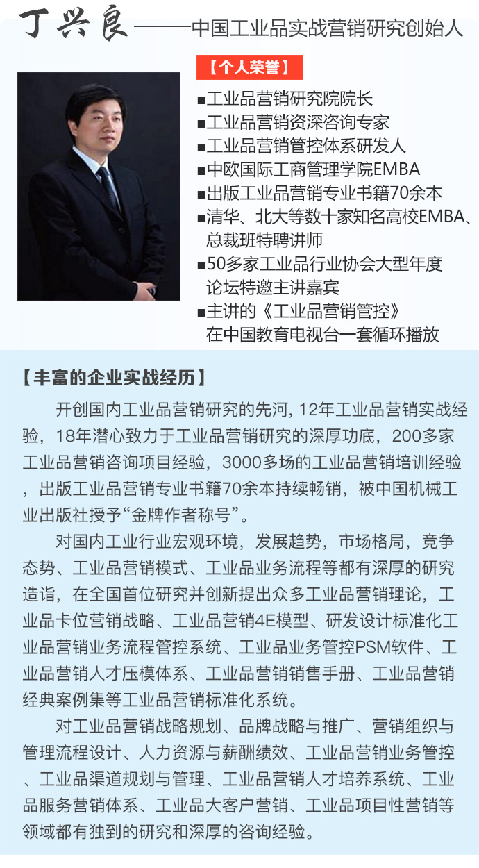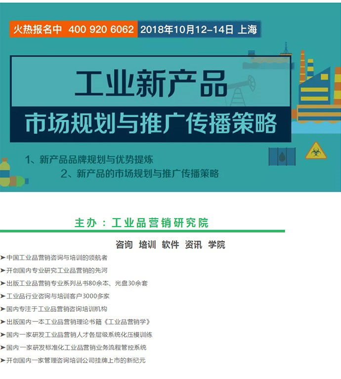 【新產(chǎn)品品牌及推廣開課預(yù)告】 10月12-14日 工業(yè)新產(chǎn)品市場規(guī)劃與推廣傳播策略公開課 點擊次數(shù):7168發(fā)布時間:2018-6-28 11:27:40 上一條:【營銷管控公開課預(yù)告】10月26-27日 深度營銷管控系列“工業(yè)品營銷管控”公開課!下一條:【大客戶營銷公開課預(yù)告】 9月14-16日 經(jīng)典工業(yè)品大客戶營銷系統(tǒng)公開課