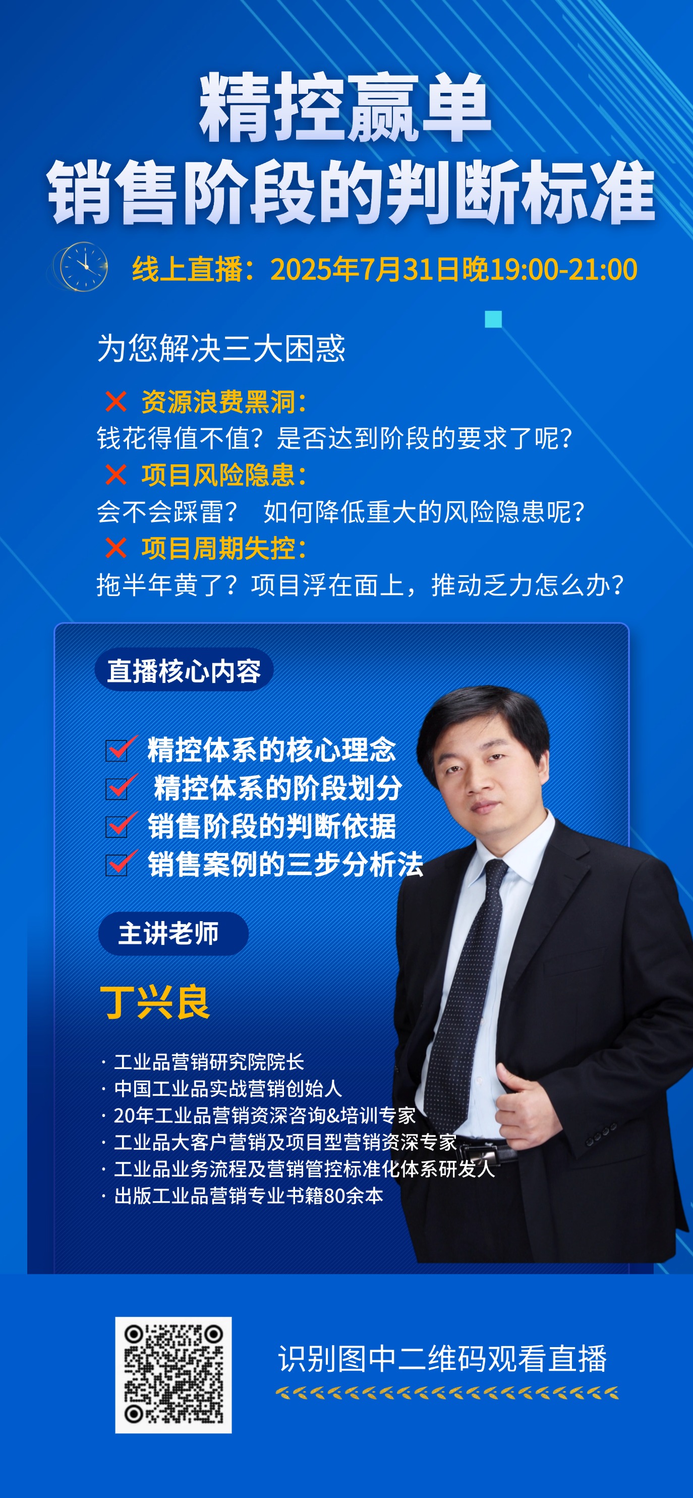 2025年7月31日精控贏單-銷售階段的判斷標(biāo)準(zhǔn)直播公開課 點(diǎn)擊次數(shù):1292發(fā)布時(shí)間:2025-7-29 17:30:17 上一條:2025工業(yè)品銷售人才復(fù)制系統(tǒng)訓(xùn)練營圓滿收官!3大階段實(shí)戰(zhàn)賦能,助力企業(yè)打造精英鐵軍!下一條:【報(bào)名啟動(dòng)】2025年8月16日-逆勢增長的“底層密碼”上海公開課