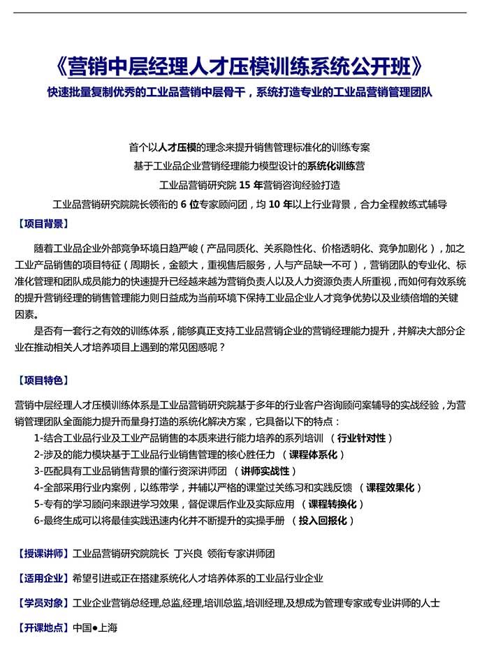 【往期公開課】9月至12月營銷中層經(jīng)理人才壓模訓(xùn)練系統(tǒng)公開班 點(diǎn)擊次數(shù):10815發(fā)布時(shí)間:2016-9-18 14:22:19 上一條:【往期論壇】9月24-25 經(jīng)濟(jì)下行,企業(yè)應(yīng)對(duì)之道下一條:【往期公開課】10月14-15號(hào)深度接觸的十三刀/4P營銷策略/高層公關(guān)的七劍下天山