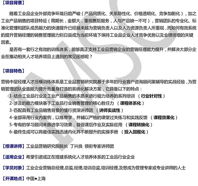 快速批量復(fù)制優(yōu)秀的工業(yè)品營銷中層骨干,系統(tǒng)打造專業(yè)的工業(yè)品營銷管理團(tuán)隊(duì)