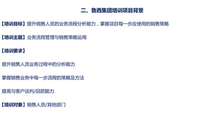 魯西化工集團(tuán)此次培訓(xùn)的項(xiàng)目背景如下:為了提升銷售人員的業(yè)務(wù)流程分析能力,掌握項(xiàng)目每一步應(yīng)使用的銷售策略。希望培訓(xùn)可以達(dá)到的要求是:提升銷售人員業(yè)務(wù)過程中的分析能力,掌握業(yè)務(wù)中每一步流程的策略及方法提高與客戶的談判以及回款能力。