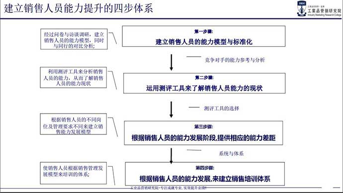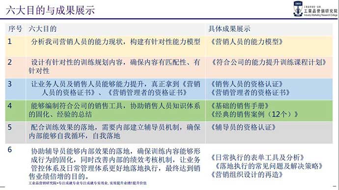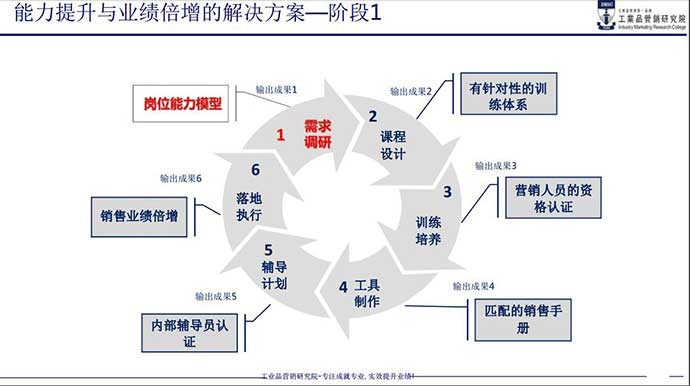 本次培訓(xùn),通過全面營銷人員素質(zhì)能力模型的構(gòu)建和分析,量身定制營銷培訓(xùn)方案,旨在系統(tǒng)化提升營銷人員的綜合銷售能力,提升營銷人員的職業(yè)化素養(yǎng),規(guī)范工業(yè)品營銷業(yè)務(wù)流程及階段里程碑任務(wù),系統(tǒng)化訓(xùn)練工業(yè)品營銷的技能,咨詢式一對一落地輔導(dǎo),導(dǎo)入系統(tǒng)規(guī)范化的銷售手冊,全程采用調(diào)研+分析+分層級定制化+分階段系統(tǒng)培訓(xùn)+案例演練+工具導(dǎo)入+咨詢式落地輔導(dǎo)+銷售手冊導(dǎo)入+跟蹤輔導(dǎo)