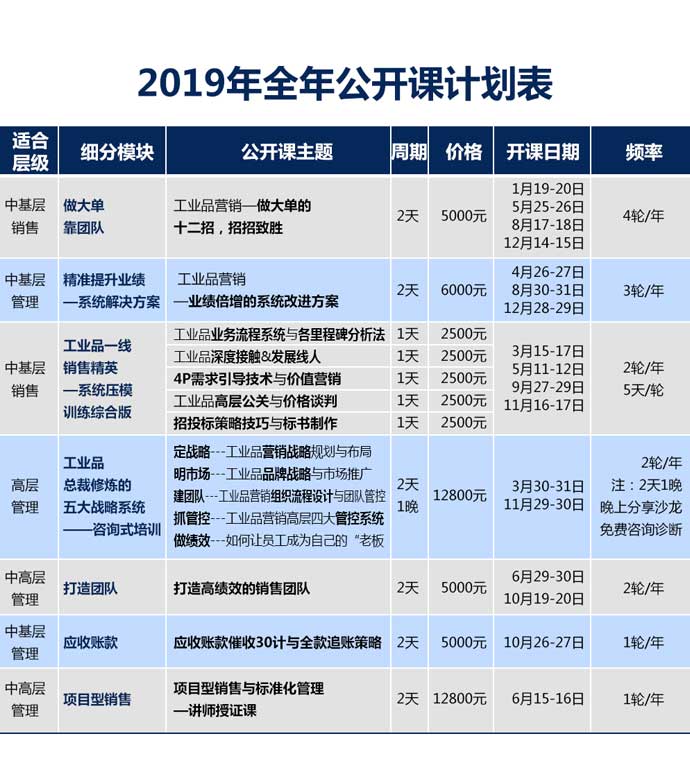 【培訓(xùn)計(jì)劃】2019年 工業(yè)品營(yíng)銷研究院培訓(xùn)計(jì)劃 點(diǎn)擊次數(shù):11553發(fā)布時(shí)間:2018-12-4 11:44:39 上一條:2019年-工業(yè)品營(yíng)銷研究院—公開課開課表最新公布下一條:2019年工業(yè)品營(yíng)銷研究院-綜合產(chǎn)品線