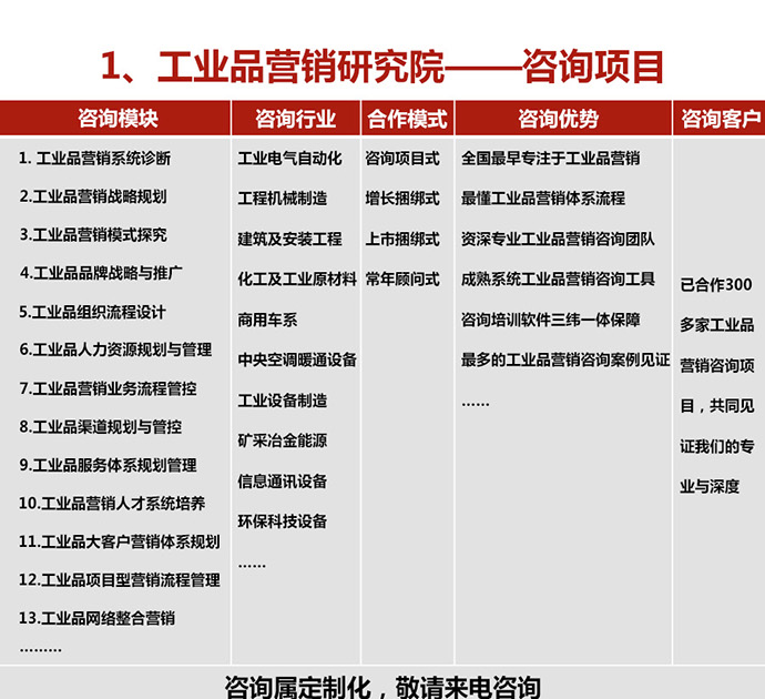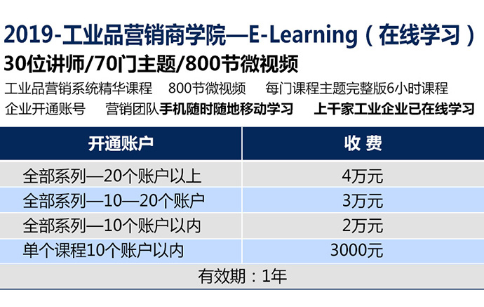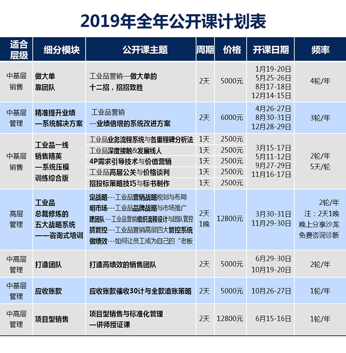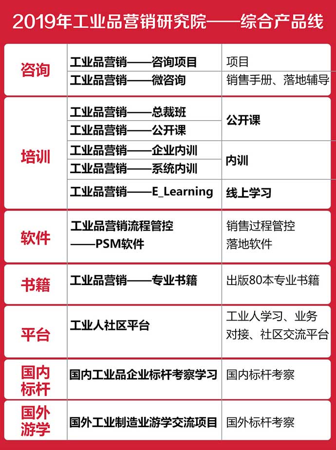 2019年工業(yè)品營銷研究院-綜合產(chǎn)品線 點擊次數(shù):18043發(fā)布時間:2019-1-11 13:46:42 上一條:【培訓(xùn)計劃】2019年 工業(yè)品營銷研究院培訓(xùn)計劃下一條:【培訓(xùn)新聞】研究院為北京歐林特開展《雙贏商務(wù)談判實戰(zhàn)策略與技巧》培訓(xùn)