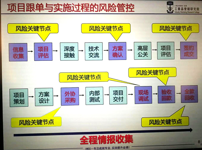 對于工業(yè)品企業(yè)逾期的應(yīng)收賬款而言,超過一年期回收成功的可能性只有26.6%左右,超過兩年成功回收的可能性只有13.6%左右,時間真是一把殺豬刀。實現(xiàn)事前、事中、事后從跟單的過程到項目交付的全過程關(guān)鍵節(jié)點作風(fēng)險控制,是降低項目型營銷風(fēng)險的最有效的辦法。