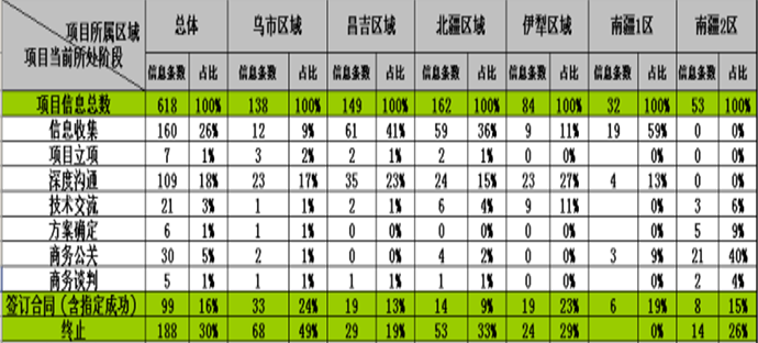 處于信息收集階段的有160條,占信息總數(shù)的26%;處于立項階段的有7條,占1%;處于深度溝通階段的有109條,占18%;處于技術(shù)交流階段的有21條,占3%;處于方案確定階段的有6條,占1%;處于商務(wù)攻關(guān)階段的有30條,占5%;處于商務(wù)談判階段的有5條,占1%;已簽訂型材合同(含指定成功)的有99條,占16%;因定競品及替代材料品而形成終止的有188條,占30%。