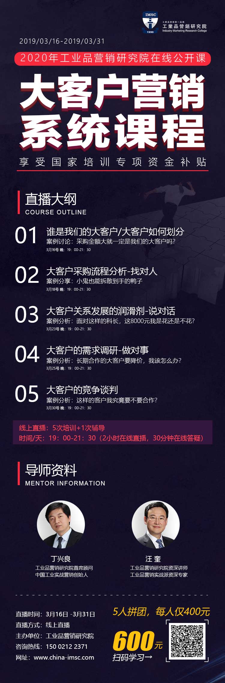 3月16日—3月31日,在線直播:工業(yè)品大客戶營銷系統(tǒng)公開課 點擊次數(shù):11293發(fā)布時間:2020-3-15 3月16日—3月31日,在線直播:工業(yè)品大客戶營銷系統(tǒng)公開課(15個小時,適合中基層,線下公開課原價5000元/人),5次直播課程,2:30小時/次+1次2小時深度輔導! 上一條:3月16日~4月25日工業(yè)品營銷研究院大型在線系統(tǒng)公開課,為您排憂解難!下一條:3月20日—4月17日,在線直播:工業(yè)品營銷精英壓模系統(tǒng)公開課