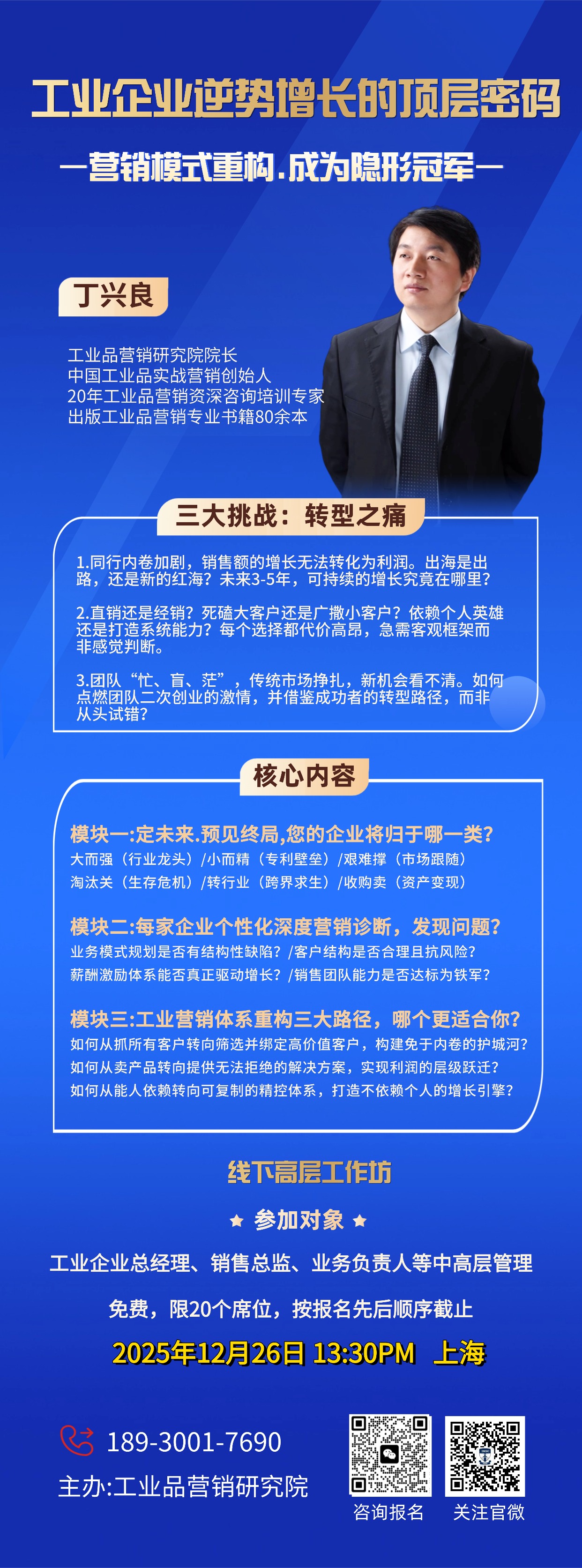 2025年12月26日工業(yè)企業(yè)逆勢增長的底層密碼-線下高層工作坊 點(diǎn)擊次數(shù):272發(fā)布時間:2025-12-22 14:48:11 上一條:揚(yáng)帆出海,通路致勝 | 研究院與廣西柳工集團(tuán)《海外渠道體系化建設(shè)》專項(xiàng)內(nèi)訓(xùn)圓滿結(jié)束下一條:2026年1月23-24日-鍛造銷售鐵軍:構(gòu)建可持續(xù)的業(yè)績增長引擎-公開課