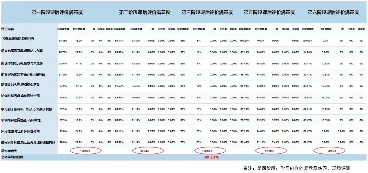 根據(jù)統(tǒng)計(jì)數(shù)據(jù)顯示,此次系統(tǒng)培訓(xùn)得到了學(xué)員的一致好評和認(rèn)可,總體滿意度高達(dá)99.23%。