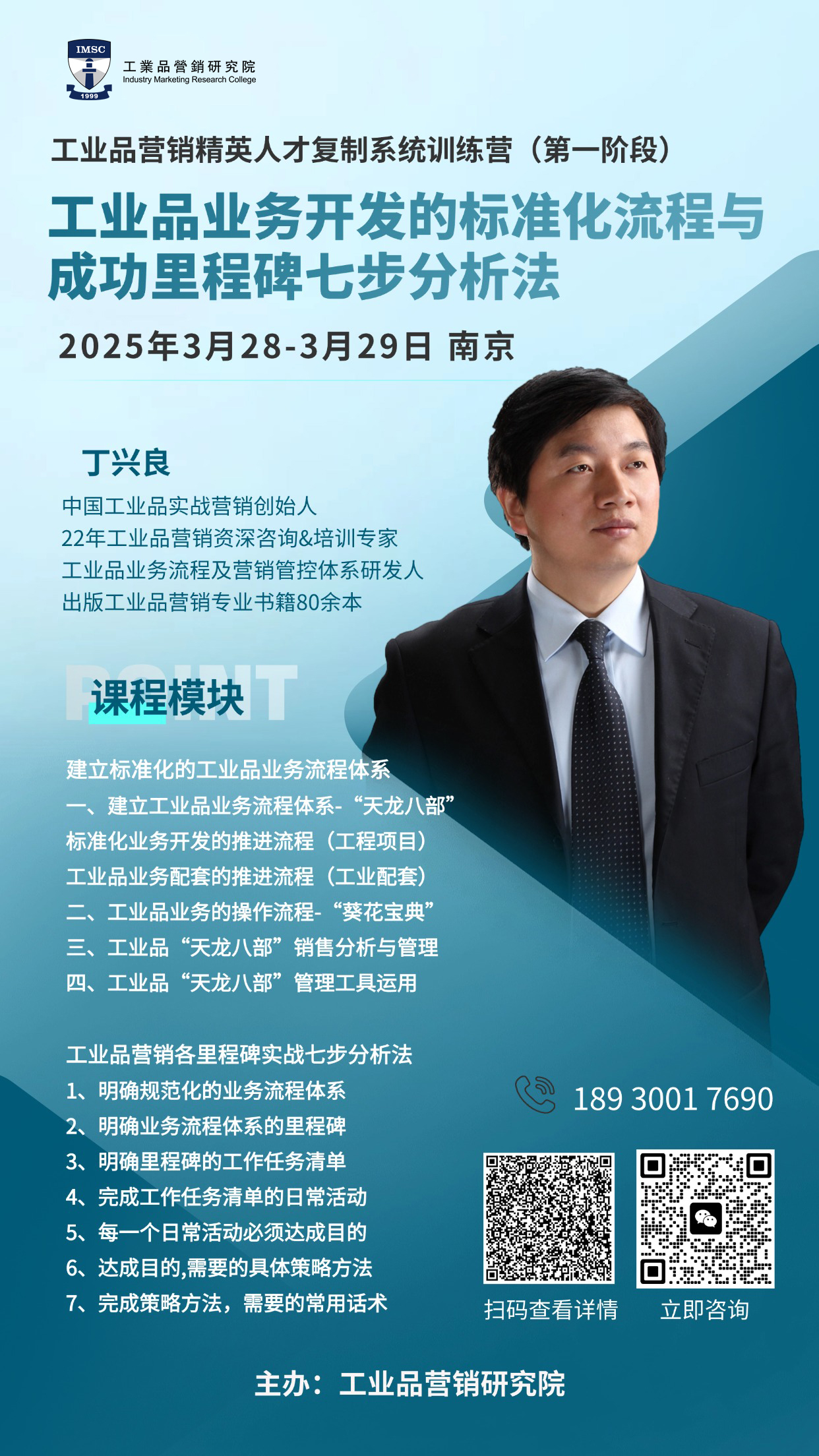 2025工業(yè)品銷售人才復(fù)制系統(tǒng)訓(xùn)練營第一階段課程南京站招生中 點(diǎn)擊次數(shù):3248發(fā)布時(shí)間:2025-3-4 15:37:47 上一條:2025年1月工業(yè)品營銷研究院與中鼎恒盛氣體設(shè)備《FABE銷售話術(shù)與實(shí)戰(zhàn)運(yùn)用》課程培訓(xùn)圓滿結(jié)束下一條:2025工業(yè)品銷售人才復(fù)制系統(tǒng)訓(xùn)練營招生中
