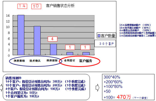 舉例:根據(jù)PSM營(yíng)銷業(yè)務(wù)管理系統(tǒng)的漏斗管理模型來(lái)建立銷售團(tuán)隊(duì)業(yè)績(jī)預(yù)測(cè)??蛻翡N售狀態(tài)分析圖如圖1-3所示。