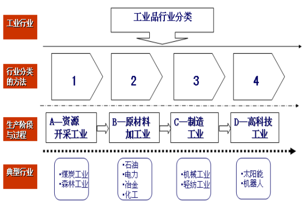 工業(yè)品行業(yè)的分類應(yīng)依據(jù)從資源開采到原材料加工,再到最終產(chǎn)品制造,最后到高科技發(fā)展這個生產(chǎn)階段和過程為基本框架。
