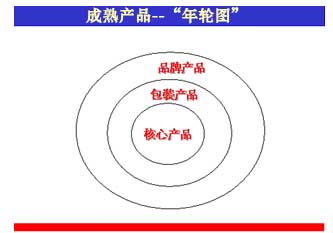 如圖,可以看到一個(gè)能夠提供給市場(chǎng),并能滿足企業(yè)客戶使用需求的成熟產(chǎn)品的結(jié)構(gòu),它由三個(gè)層次組成,分別是核心產(chǎn)品、包裝產(chǎn)品及品牌產(chǎn)品,這就是我們所說的三個(gè)核心。核心產(chǎn)品位于內(nèi)部,包裝產(chǎn)品處于中間,品牌產(chǎn)品包括核心產(chǎn)品和包裝產(chǎn)品,最終形成一個(gè)年輪的圖像。