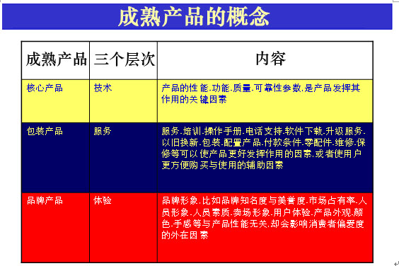 從現(xiàn)代工業(yè)品營(yíng)銷的角度看,成熟產(chǎn)品必須包括以下幾個(gè)層次,即:核心產(chǎn)品、包裝產(chǎn)品、品牌產(chǎn)品。