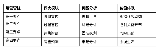 運(yùn)營(yíng)管控主要是指在營(yíng)銷過(guò)程當(dāng)中對(duì)銷售信息的管控、項(xiàng)目的管控及費(fèi)用的管控等,從而實(shí)現(xiàn)一切盡在掌控之中。運(yùn)營(yíng)管控的實(shí)質(zhì),是資源的管控, 即對(duì)企業(yè)擁有的資源進(jìn)行充分的有效調(diào)解。運(yùn)營(yíng)管控表如表2-3所示。